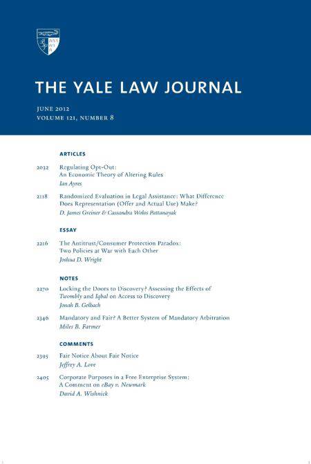 This issue of The Yale Law Journal (the 8th issue of Volume 121, academic year 2011-2012, for June 2012) features articles and essays by several notable scholars. Principal contributors include leading scholars in their fields. Contributions includes articles by Ian Ayers on opt-out provisions and an economic theory of rule-altering and by James Greiner and Cassandra Pattanayak on randomized evaluation in legal assistance, as well as an essay by Joshua Wright on the dichotomy between antitrust policy and consumer protection. Student work explores discovery law after recent changes in pretrial dismissal standards, a proposal for a fair mandatory arbitration scheme, fair notice provisions, and corporate purposes in light of the Craigslist-eBay litigation.