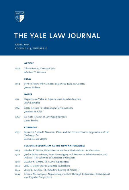 The April 2014 issue of The Yale Law Journal (Vol. 123, No. 6) features new articles and essays on law and legal theory by internationally recognized scholars. An extensive Feature explores the idea of Federalism as the New Nationalism, with contributions by Jessica Bulman-Pozen ("From Sovereignty and Process to Administration and Politics: The Afterlife of American Federalism"), Heather Gerken ("An Overview," "The Loyal Opposition"), Abbe Gluck ("Our [National] Federalism"), Alison LaCroix ("The Shadow Powers of Article I"), and Cristina Rodriguez ("Negotiating Conflict Through Federalism: Institutional and Popular Perspectives").