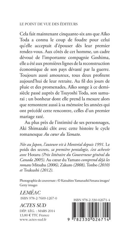 Il y a près de cinquante-six ans, Aïko s'unissait à celui dont elle était tombée amoureuse au premier regard échangé dans un train. Après un mariage raté conclu par un divorce, elle n'espérait pas vivre une histoire aussi passionnée qu'harmonieuse. Pour sa petite- nièce, qui va bientôt se marier et s'interroge sur la pérennité du lien conjugal, elle se remémore un demi-siècle d'amour profond au côté de son samurai.