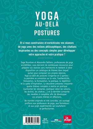 Et si vous construisiez et enrichissiez vos séances de yoga avec des notions philosophiques, des citations inspirantes ou des concepts simples pour développer votre approche et votre pratique ? Sage Rountree et Alexandra DeSiato, professeures de yoga accréditées, vous donnent de nombreuses ressources pour préparer vos séances sans monotonie et mettent à votre disposition un catalogue de thèmes dans lequel puiser pour composer vos propres séances. Yoga au-delà des postures s’organise en 3 parties : la première se concentre sur la voix, l’authenticité, l’émulation, la formulation, la pratique, la répétition et la quête d’inspiration. La deuxième présente cinquante-quatre thèmes complets à mettre en pratique (surmonter les obstacles, pratiquer selon les saisons, les doshas, les chakras…) et la dernière comporte des modèles à compléter afi n de développer vos propres thèmes et réflexions. De manière originale et très concrète, cet ouvrage profitera aux professeurs de yoga, aux formateurs et aux yogis expérimentés qui souhaitent se perfectionner.