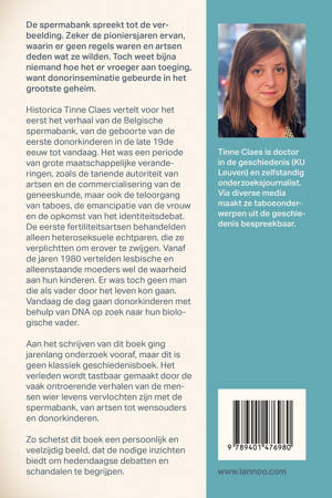 Historica Tinne Claes vertelt voor het eerst het verhaal van de Belgische spermabank, van de geboorte van de eerste donorkinderen in de late 19de eeuw tot vandaag. Het was een periode van grote maatschappelijke veranderingen, zoals de tanende autoriteit van artsen en de commercialisering van de geneeskunde, maar ook de teloorgang van taboes, de emancipatie van de vrouw en de opkomst van het identiteitsdebat. De eerste fertiliteitsartsen behandelden alleen heteroseksuele echtparen, die ze verplichtten om erover te zwijgen. Vanaf de jaren 1980 vertelden lesbische en alleenstaande moeders wel de waarheid aan hun kinderen. Er was toch geen man die als vader door het leven kon gaan. Vandaag de dag gaan donorkinderen met behulp van DNA op zoek naar hun biologische vader.