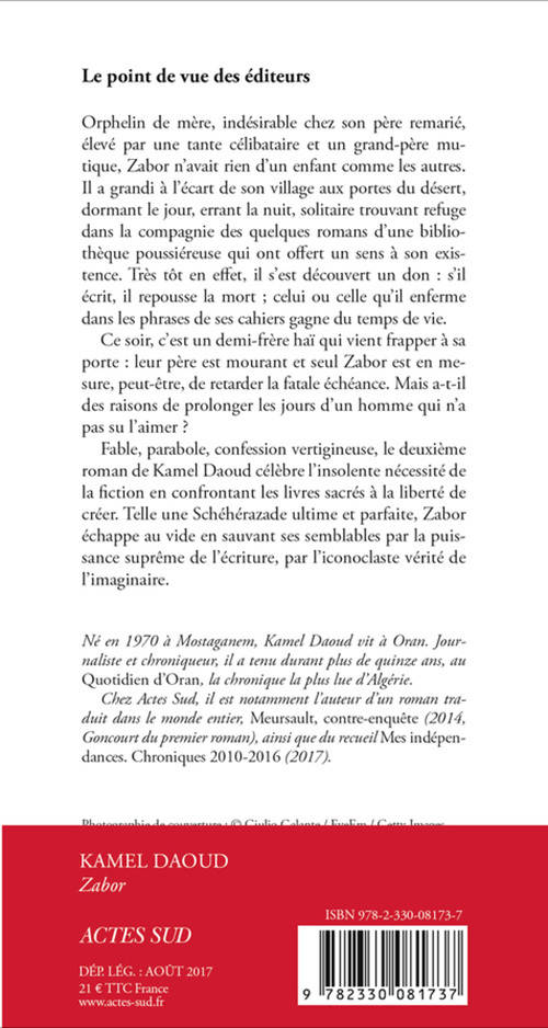 Fable, parabole, confession vertigineuse, le deuxième roman de Kamel Daoud célèbre l'insolente nécessité de la ficion en confrontant les livres sacrés à la liberté de créer. Telle une Shéhérazade ultime et parfaite, Zabor échappe au vide en sauvant ses semblables par la puissance suprême de l'écriture, par l'iconoclaste vérité de l'imaginaire.