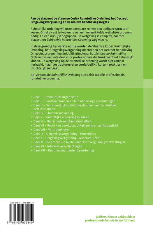 In deze grondig herwerkte editie worden de Vlaamse Codex Ruimtelijke Ordening, het Omgevingsvergunningsdecreet en het Decreet Handhaving Omgevingsvergunning duidelijk uitgelegd: het Zakboekje ruimtelijke ordening is een inleiding voor professionals die bruikbaarheid belangrijk vinden. De wetgeving over de ruimtelijke ordening wordt niet zomaar herhaald, maar gestructureerd en verduidelijkt, kortom praktisch en inzichtelijk gemaakt.