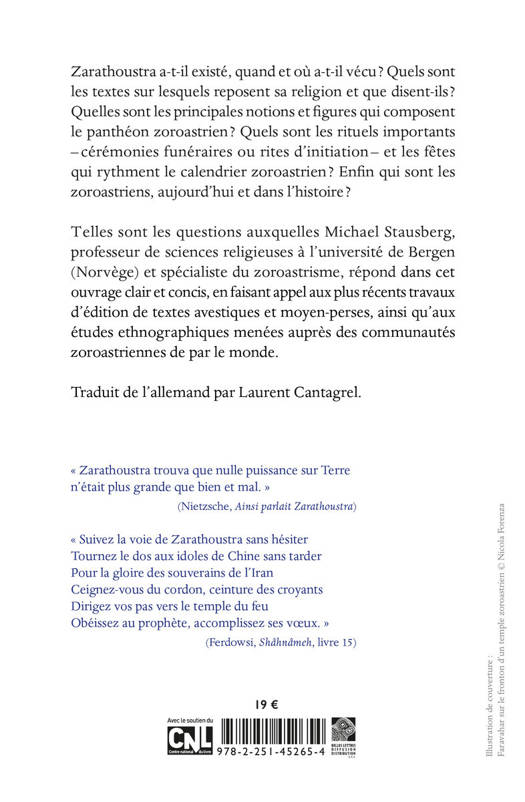 Zarathoustra a-t-il existe, quand et ou a-t-il vecu ? Quels sont les textes sur lesquels reposent sa religion et que disent-ils ? Quelles sont les principales notions et figures qui composent le pantheon zoroastrien ? Quels sont les rituels importants - ceremonies funeraires ou rites d'initiation - et les fetes qui rythment le calendrier zoroastrien ? Enfin qui sont les zoroastriens, aujourd'hui et dans l'histoire ? Telles sont les questions auxquelles Michael Stausberg, professeur de sciences religieuses a l'universite de Bergen (Norvege) et specialiste du zoroastrisme, repond dans cet ouvrage clair et concis, en faisant appel aux plus recents travaux d'edition de textes avestiques et moyen-perses, ainsi qu'aux etudes ethnographiques menees aupres des communautes zoroastriennes de par le monde. Zarathoustra trouva que nulle puissance sur Terre n'etait plus grande que bien et mal. (Nietzsche, Ainsi parlait Zarathoustra) Suivez la voie de Zarathoustra sans hesiter Tournez le dos aux idoles de Chine sans tarder Pour la gloire des souverains de l'Iran Ceignez-vous du cordon, ceinture des croyants Dirigez vos pas vers le temple du feu Obeissez au prophete, accomplissez ses voeux. (Ferdowsi, Shahnameh, livre 15)