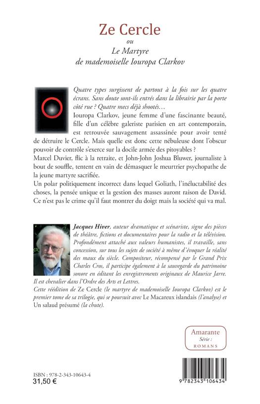 Iouropa Clarkov, jeune femme d'une fascinante beauté, fille d'un célèbre galeriste parisien en art contemporain, est retrouvée sauvagement assassinée pour avoir tenté de détruire le cercle. Mais quelle est donc cette nébuleuse dont l'obscur pouvoir de contrôle s'exerce sur la docile armée des pitoyables ? Marcel Duvier, flic à la retraite, et John-John Joshua Bluwer, journaliste à bout de souffle, tentent en vain de démasquer le meurtrier psychopathe de la jeune martyre sacrifiée. Un polar politiquement incorrect dans lequel Goliath, l'inéluctabilité des choses, la pensée unique et la gestion des masses auront raison de David. Ce n'est pas le crime qu'il faut montrer du doigt mais la société qui va mal.