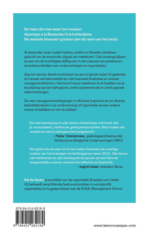 De haan die niet meer kon kraaien Asperges à la flamande/à la hollandaise De mooiste bloemen groeien aan de rand van het ravijn Al duizenden jaren maken leiders, politici en filosofen dankbaar gebruik van de kracht die uitgaat van metaforen. Ook vandaag blijven ze een van de krachtigste stijlfiguren in het arsenaal van sprekers en verantwoordelijken van ondernemingen en organisaties. Zeg het met een beeld combineert op een originele wijze 52 gekende en nieuwe verhalenmetaforen met evenveel illustraties en actuele managementthema's. Het toont hoe je metaforen kunt inzetten om je boodschap op een behapbare, enthousiasmerende en overtuigende wijze te brengen. De vele managementuitdagingen in dit boek inspireren je om diverse beleidsdomeinen in je onderneming of organisatie op een andere manier te bekijken en aan te pakken.