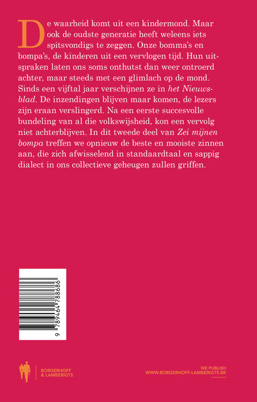 Sinds een vijftal jaar verschijnen ze in Het Nieuwsblad. De inzendingen blijven maar komen, de lezers zijn eraan verslingerd. Na een eerste succesvolle bundeling van al die volkswijsheid, kon een vervolg niet achterblijven. In dit tweede deel van Zei mijnen bompa treffen we opnieuw de beste en mooiste zinnen aan, die zich afwisselend in standaardtaal en sappig dialect in ons collectieve geheugen zullen griffen.