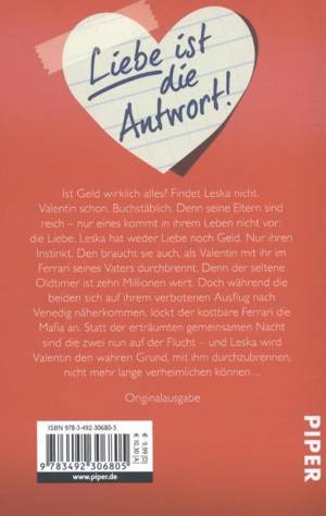 Liebe ist die Antwort! Ist Geld wirklich alles? Findet Leska nicht. Valentin schon. Buchstäblich. Denn seine Eltern sind reich - nur eines kommt in ihrem Leben nicht vor: die Liebe. Leska hat weder Liebe noch Geld. Nur ihren Instinkt. Den braucht sie auch, als Valentin mit ihr im Ferrari seines Vaters durchbrennt. Denn der seltene Oldtimer ist zehn Millionen wert. Doch während die beiden sich auf ihrem verbotenen Aus¿ug nach Venedig näherkommen, lockt der kostbare Ferrari die Mäa an. Statt der erträumten gemeinsamen Nacht sind die zwei nun auf der Flucht - und Leska wird Valentin den wahren Grund, mit ihm durchzubrennen, nicht mehr lange verheimlichen können ... Originalausgabe