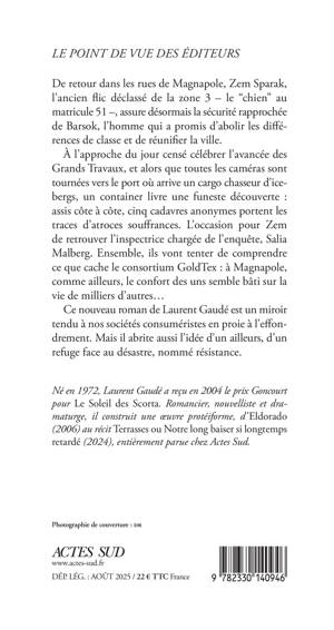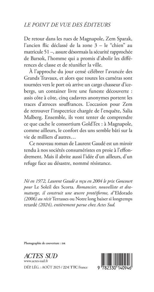 De retour dans les rues de Magnapole, Zem Sparak, l'ancien flic déclassé de la zone 3 - le "chien" au matricule 51 -, assure désormais la sécurité rapprochée de Barsok, l'homme qui a promis d'abolir les différences de classe et de réunifier la ville. À l'approche du jour censé célébrer l'avancée des Grands Travaux, et alors que toutes les caméras sont tournées vers le port où arrive un cargo chasseur d'icebergs, un container livre une funeste découverte : assis côte à côte, cinq cadavres anonymes portent les traces d'atroces souffrances. L'occasion pour Zem de retrouver l'inspectrice chargée de l'enquête, Salia Malberg. Ensemble, ils vont tenter de comprendre ce que cache le consortium GoldTex : à Magnapole, comme ailleurs, le confort des uns semble bâti sur la vie de milliers d'autres... Ce nouveau roman de Laurent Gaudé est un miroir tendu à nos sociétés consuméristes en proie à l'effondrement. Mais il abrite aussi l'idée d'un ailleurs, d'un refuge face au désastre, nommé résistance.