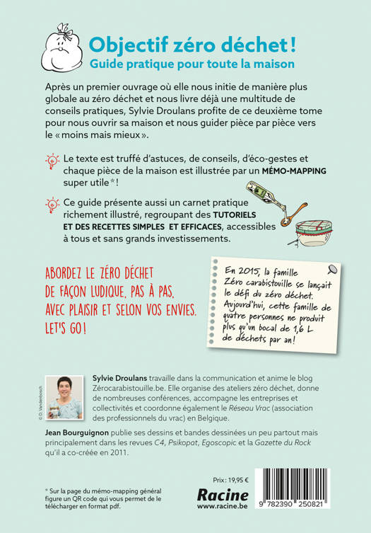 Après un premier ouvrage où elle nous initie de manière plus globale au zéro déchet et nous livre déjà une multitude de conseils pratiques, Sylvie Droulans profite de ce deuxième tome pour nous ouvrir sa maison et nous guider pièce par pièce vers le « moins mais mieux ». Le texte est truffé d'astuces, de conseils, d'éco-gestes et chaque pièce de la maison est illustrée par un MÉMO-MAPPING super utile*! Ce guide présente aussi un carnet pratique richement illustré, regroupant des TUTORIELS ET DES RECETTES SIMPLES ET EFFICACES, accessibles à tous et sans grands investissements. Abordez le zéro déchet de façon ludique, pas à pas, avec plaisir et selon vos envies. Let's go ! En 2015, la famille Zéro carabistouille se lançait le défi du zéro déchet. Aujourd'hui, cette famille de quatre personnes ne produit plus qu'un bocal de 1,6 L de déchets par an ! * Sur la page du mémo-mapping général, figure un QR code qui vous permet de le télécharger en format pdf.