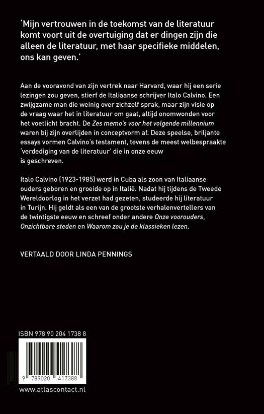Aan de vooravond van zijn vertrek naar Harvard, waar hij een serie colleges zou geven, stierf Italo Calvino. De Zes memo’s voor het volgende millennium waren bij zijn overlijden in conceptvorm af. Deze speelse, briljante essays vormen Calvino’s testament, tevens de meest welbespraakte ‘verdediging van de literatuur’ die in onze eeuw is geschreven.