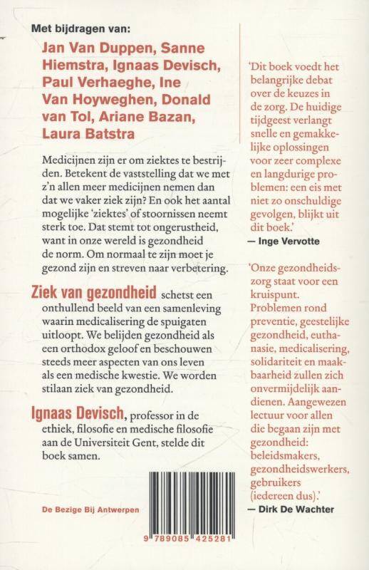 In Ziek van gezondheid wordt een onthullend beeld geschetst van een samenleving waarin medicalisering de spuigaten uitloopt. Uiteraard werkt onze tijd een aantal grote gezondheidsproblemen in de hand. Maar we belijden gezondheid als een orthodox geloof en beschouwen steeds meer aspecten van ons leven als een medische kwestie. We worden stilaan ziek van gezondheid.
