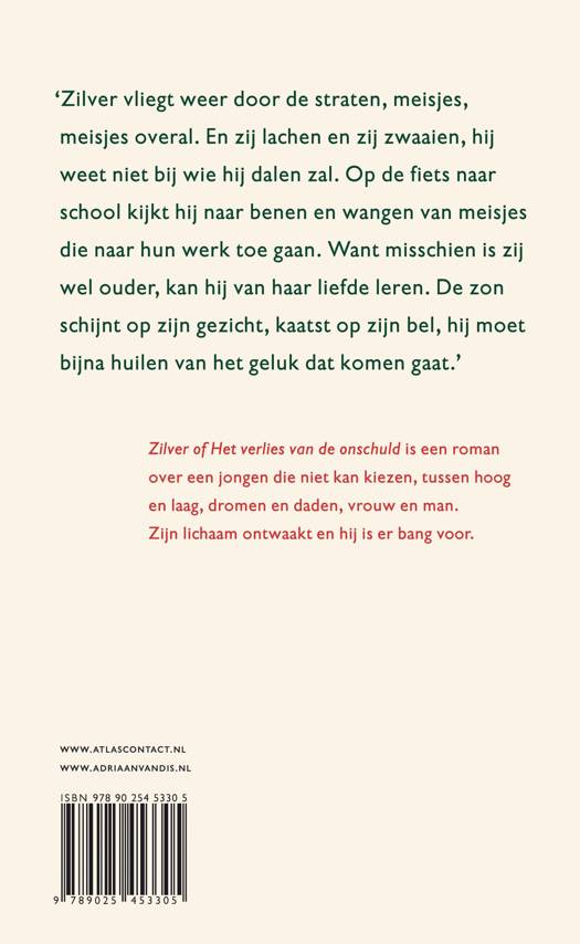 'Zilver of Het verlies van de onschuld' van Adriaan van Dis is een roman over een jongen die man moet worden. Hij kent zijn ouders niet, alleen de strenge hand van de Juffrouw en later de kilte van een kostschool. Hij is nieuwsgierig, laat zich lokken en verleiden en verliest zijn onschuld. Hij wil in anderen opgaan en ook zichzelf blijven, verzet zich tegen zijn eenzaamheid maar wil die ook behouden. 'Zilver' is een roman over een jongen die niet kan kiezen, tussen hoog en laag, dromen en daden, vrouw en man. Zijn lichaam ontwaakt en hij is er bang voor. Deze editie is voorzien van prachtige illustraties door Joost Roelofsz.