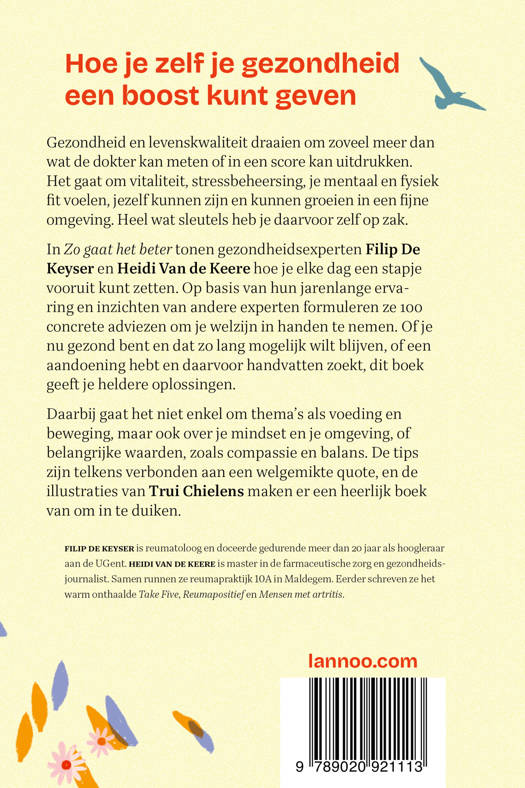 In Zo gaat het beter tonen gezondheidsexperten Filip De Keyser en Heidi Van de Keere hoe je elke dag een stapje vooruit kunt zetten. Op basis van hun jarenlange ervaring en inzichten van andere experten formuleren ze 100 concrete en behapbare adviezen om je welzijn in handen te nemen. Of je nu gezond bent en dat zo lang mogelijk wilt blijven, of een aandoening hebt en daarvoor handvatten zoekt, dit boek geeft je heldere oplossingen.