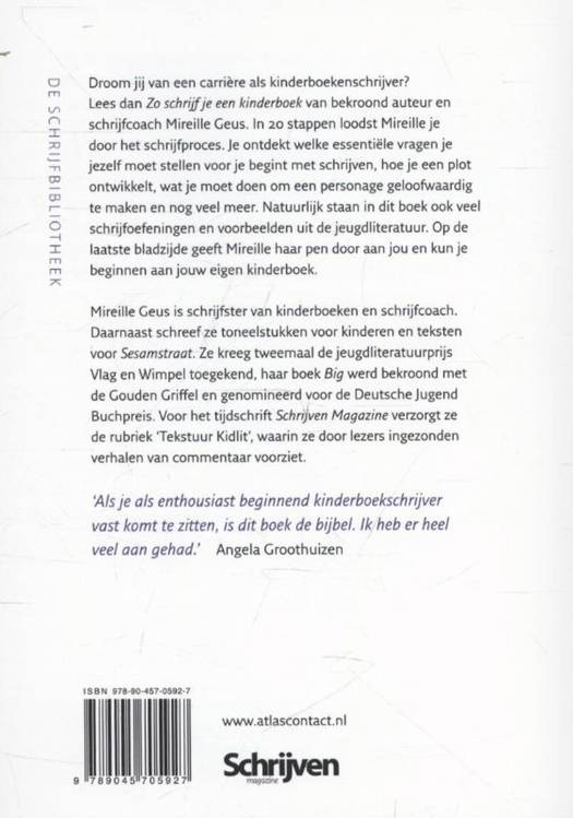 Droom jij van een carrière als kinderboekenschrijver? Lees dan Zo schrijf je een kinderboek van bekroond auteur en schrijfcoach Mireille Geus. In 20 stappen loodst Mireille je door het schrijfproces. Je ontdekt welke essentiële vragen je jezelf moet stellen voor je begint met schrijven, hoe je een plot ontwikkelt, wat je moet doen om een personage geloofwaardig te maken en nog veel meer. Natuurlijk staan in dit boek ook veel schrijfoefeningen en voorbeelden uit de jeugdliteratuur. Op de laatste bladzijde geeft Mireille haar pen door aan jou en kun je beginnen aan jouw eigen kinderboek.