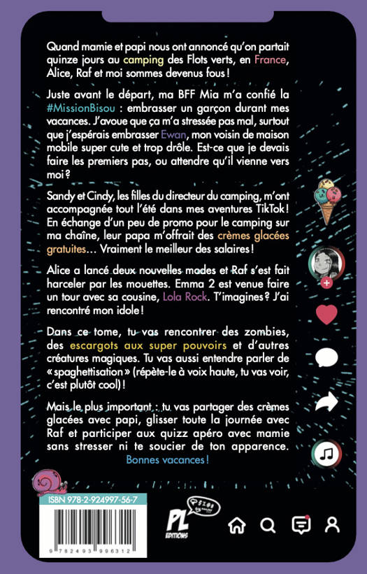 Quand mamie et papi nous ont annoncé qu’on partait quinze jours au camping des Flots verts, en France, Alice, Raf et moi sommes devenus fous ! Juste avant le départ, ma BFF Mia m’a confié la #MissionBisou : embrasser un garçon durant mes vacances. J’avoue que ça m’a stressée pas mal, surtout que j’espérais embrasser Ewan, mon voisin de maison mobile super cute et trop drôle. Est-ce que je devais faire les premiers pas, ou attendre qu’il vienne vers moi ? Sandy et Cindy, les filles du directeur du camping, m’ont accompagnée tout l’été dans mes aventures TikTok! En échange d’un peu de promo pour le camping sur ma chaîne, leur papa m’offrait des crèmes glacées gratuites... Vraiment le meilleur des salaires ! Alice a lancé deux nouvelles modes et Raf s’est fait harceler par les mouettes. Emma 2 est venue faire un tour avec sa cousine, Lola Rock. T’imagines? J’ai rencontré mon idole !