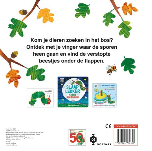 'Rupsje Nooitgenoeg - Zoek & vind' is een kartonnen zoekboek waarin peuters kunnen speuren naar hun wereldberoemde, hongerige vriendje. Onderweg komen ze achter de grote flappen ook een heleboel andere bosdieren tegen. De welbekende, tijdloze illustraties van Eric Carle spatten ook in dit boek prachtig van de pagina's. Voor kinderen vanaf 18 maanden.