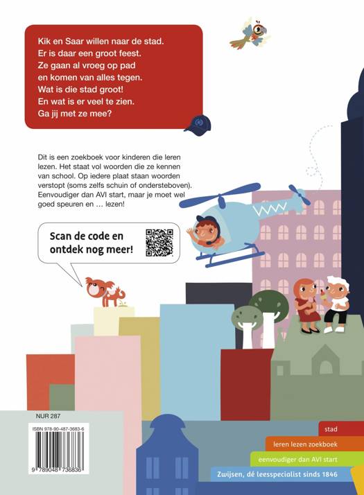 In dit zoekboek over Kik en Saar zijn woorden verstopt. Heel veel woorden. Het zijn de woorden die kinderen leren op school: kim, ik , maan, vis, roos, en nog veel meer. Je blijft kijken in dit boek waarin Kik en Saar dwars door de stad lopen op weg naar een festival in het park. De zoekwoorden zijn eenvoudiger dan AVI start, maar je moet wel goed speuren en lezen! Dat maakt dit boek leuk én uitdagend.