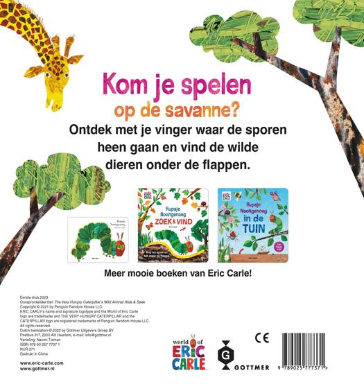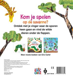 Het werk van Eric Carle schittert in het stevige zoekboek vol flappen 'Rupsje Nooitgenoeg zoek & vind - Wilde dieren': van olifanten tot leeuwen en van giraffen tot zebra's, allemaal spatten ze in warme kleuren van de pagina's. Op elke spread leidt een verzonken spoor, dat dreumesen en peuters met hun vingertoppen kunnen volgen, naar een grote flap waarachter een dier is verstopt. Ga met Rupsje Nooitgenoeg mee op safari en zoek de wilde dieren.