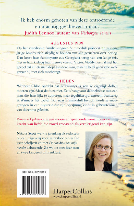 Augustus 1939Op het vreedzame familielandgoed Summerhill probeert de zestienjarige Maddy zich afzijdig te houden van alle geruchten over oorlog. Dan keert haar ¬ amboyante zus Georgiana terug van een lange reis, met in haar kielzog haar nieuwe vriend, Victor. Maddy heeft al snel het gevoel dat er iets niet klopt aan deze man, maar ze heeft geen idee welk gevaar hij met zich meebrengt.HedenWanneer Chloe ontdekt dat ze zwanger is, zou ze eigenlijk dolblij moeten zijn. Maar dat is ze niet. Ze is bang voor de toekomst met een man die haar lijkt te adoreren, maar tegelijkertijd extreem bezitterig is. Wanneer het toeval haar naar Summerhill brengt, wordt ze meegezogen in een mysterie dat zijn oorsprong vindt in gebeurtenissen van decennia geleden.Zomer vol geheimen is een mooie en spannende roman over de kracht van liefde die zowel troostend als vernietigend kan zijn.