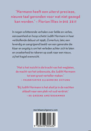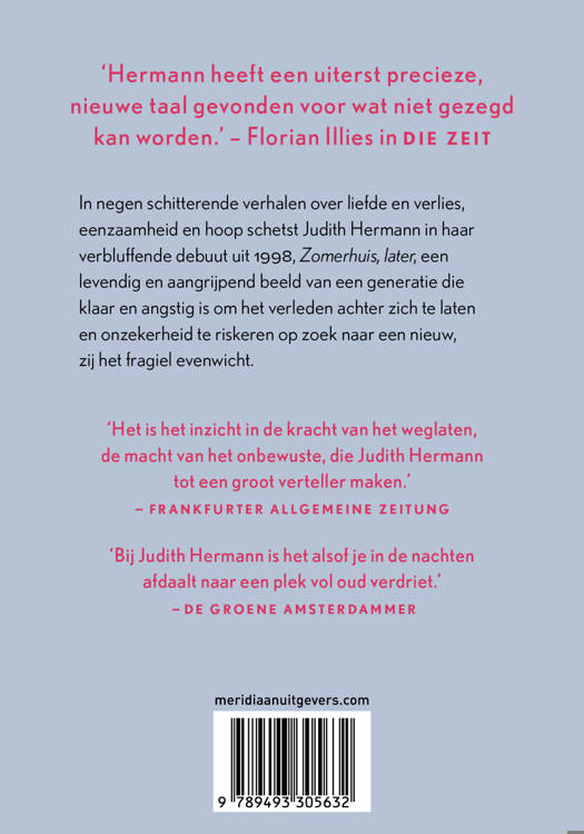 In negen schitterende verhalen over liefde en verlies, eenzaamheid en hoop schetst Judith Hermann in haar verbluffende debuut uit 1998, Zomerhuis, later, een levendig en aangrijpend beeld van een generatie die klaar en angstig is om het verleden achter zich te laten en onzekerheid te riskeren op zoek naar een nieuw, zij het fragiel evenwicht.