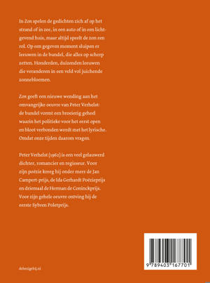 In ZON spelen de gedichten zich af op het strand of in zee, in een auto of in een lichtgevend huis, maar altijd speelt de zon een rol. Op een gegeven moment sluipen er leeuwen in de bundel, die alles op scherp zetten. Honderden, duizenden leeuwen die veranderen in een veld vol juichende zonnebloemen. ZON geeft een nieuwe wending aan het omvangrijke oeuvre van Peter Verhelst: de bundel vormt een broeierig geheel waarin het politieke voor het eerst open en bloot verbonden wordt met het lyrische. Omdat onze tijden daarom vragen.