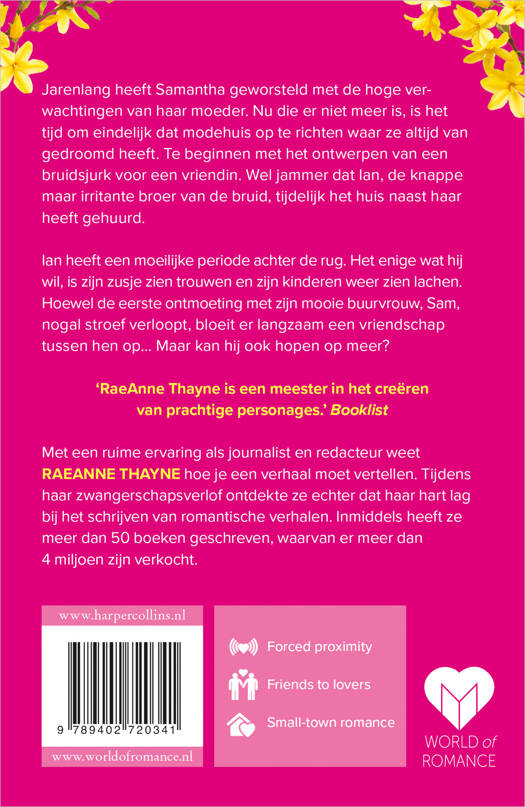 Jarenlang heeft Samantha geworsteld met de hoge verwachtingen van haar moeder. Nu die er niet meer is, is het tijd om eindelijk dat modehuis op te richten waar ze altijd van gedroomd heeft. Te beginnen met het ontwerpen van een bruidsjurk voor een vriendin. Wel jammer dat Ian, de knappe maar irritante broer van de bruid, tijdelijk het huis naast haar heeft gehuurd.