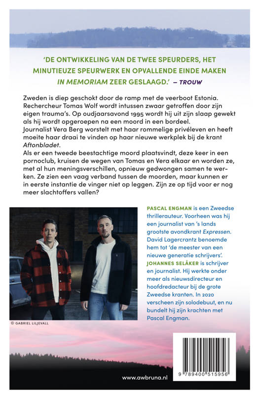 Na het succes van In memoriam zijn Pascal Engman en Johannes Selåker terug met het tweede deel van de Schaduwland-serie. In een Zweden dat diep geschokt is door de ramp in Estland, wordt politieman Tomas Wolf zwaar getroffen door zijn eigen trauma's. Op oudjaarsjaarsavond 1995 wordt hij opgeroepen voor een moord in een bordeel.