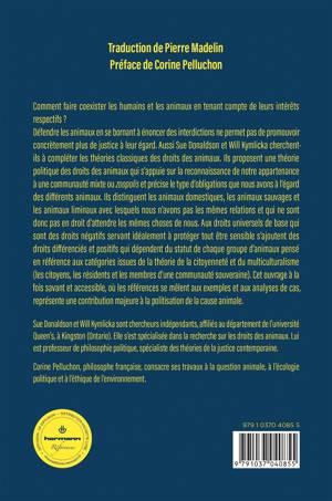 Défendre les animaux en se bornant à énoncer des interdictions ne permet pas de promouvoir concrètement plus de justice à leur égard. Aussi Sue Donaldson et Will Kymlicka cherchent-ils à compléter les théories classiques des droits des animaux. Ils proposent une théorie politique des droits des animaux qui s’appuie sur la reconnaissance de notre appartenance à une communauté mixte ou zoopolis et précise le type d’obligations que nous avons à l’égard des différents animaux. Ils distinguent les animaux domestiques, les animaux sauvages et les animaux liminaux avec lesquels nous n’avons pas les mêmes relations et qui ne sont donc pas en droit d’attendre les mêmes choses de nous. Aux droits universels de base qui sont des droits négatifs servant idéalement à protéger tout être sensible s’ajoutent des droits différenciés et positifs qui dépendent du statut de chaque groupe d’animaux pensé en référence aux catégories issues de la théorie de la citoyenneté et du multiculturalisme (les citoyens, les résidents et les membres d’une communauté souveraine). Cet ouvrage à la fois savant et accessible, où les références se mêlent aux exemples et aux analyses de cas, représente une contribution majeure à la politisation de la cause animale.