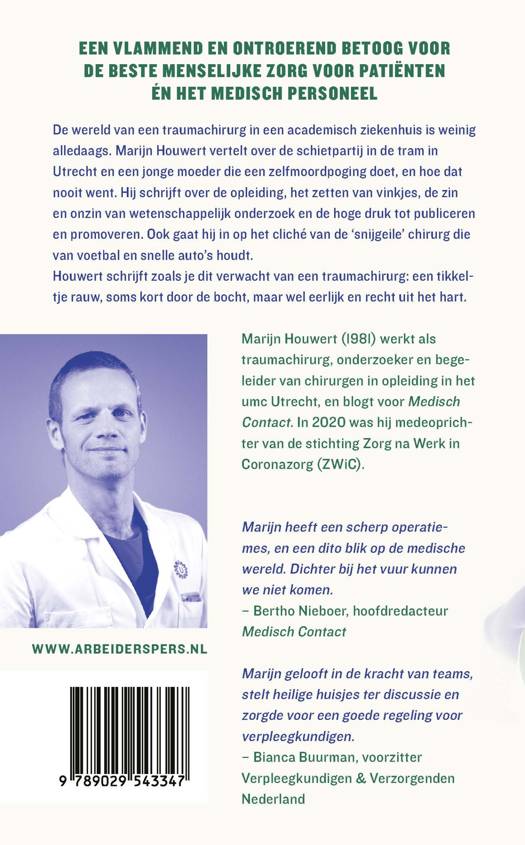 De wereld van een traumachirurg in een academisch ziekenhuis is weinig alledaags. Marijn Houwert vertelt over de schietpartij in de tram in Utrecht en een jonge moeder die een zelfmoordpoging doet, en hoe dat nooit went. Hij schrijft over de opleiding, het zetten van vinkjes, de zin en onzin van wetenschappelijk onderzoek en de hoge druk tot publiceren en promoveren. Ook gaat hij in op het cliché van de ‘snijgeile’ chirurg die van voetbal en snelle auto’s houdt.