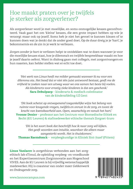 Als zorgverlener word je met moeilijke, en soms onmogelijke keuzes geconfronteerd. Vaak gaat het om 'kleine' keuzes, die een grote impact hebben op wie je verzorgt maar ook op jezelf. Soms heb je niet het gevoel te kunnen kiezen of te kunnen doen wat je denkt dat de ander goed doet. Op de duur dreig je je 'hart', je bekommernis en de zin in je werk te verliezen. Zorgen zonder je hart te verliezen helpt te ontdekken wat te doen wanneer je voor die moeilijke keuzes staat, hoe je dilemma's en twijfels bespreekbaar maakt en hoe je jezelf daarin oefent. Want in dialoog gaan met collega's, met zorgontvangers en hun naasten, kan helder stellen wat er echt toe doet.