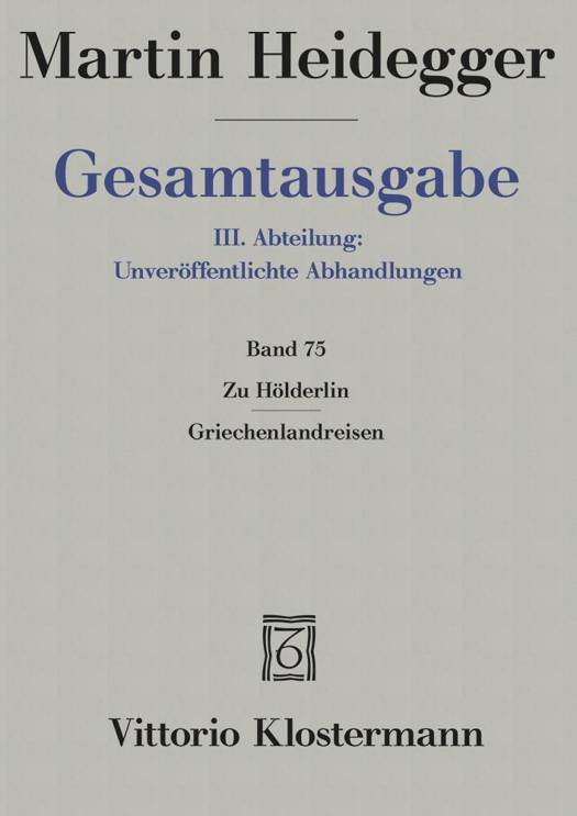 Band 75 der Gesamtausgabe enthält nachgelassene Arbeiten zu Hölderlin, zum Teil nicht abgeschlossen oder im Entwurfstadium verblieben; ferner zwei Niederschriften zu Griechenlandreisen, die "in der Zwiesprache mit Hölderlins Dichtung" unternommen wurden. Bis auf den Text der ersten Griechenlandreise, der seit 1989 unter dem Titel "Aufenthalte" als Einzelpublikation vorliegt, handelt es sich um Erstveröffentlichungen. Niederschriften zu Hölderlins "Germanien", zu "Andenken" und "Der Ister", über welche Hymnen Heidegger schon im Druck vorliegende Vorlesungen gehalten hat, zeigen, wie lange ihn diese Dichtungen intensiv beschäftigt haben. Aufzeichnungen und Entwürfe zu "Brod und Wein", "Ermunterung", "Dichterberuf", "Mnemosyne", zu den "Empedokles"-Bruchstücken und den Übersetzungen der Pindarfragmente setzen zu jeweils besonderen Ausblicken an, oft mit Verweisen auf eine Vorlesung oder eine Hölderlin-Erläuterung. Eine der bedeutendsten Arbeiten Heideggers zu Hölderlin ist der Dialog "Das abendländische Gespräch", in dem er von der Hymne "Der Ister" aus - viele andere Gedichte mitsprechen lassend - das geschickliche Wort der Dichtung Hölderlins zu erhellen unternimmt. Aufzeichnungen unter dem Titel "Die Fuge der Huld. Der Dank" stehen im Gedachten und in der Form den "Beiträgen zur Philosophie" (HGA Bd. 65) nahe; sie deuten auf die innere Einheit des "Ereignis"-Gedankens mit Heideggers Verständnis Hölderlins. In den Griechenlandreisen beruft Heidegger den griechischen Anfang der abendländischen Geschichte mit dem wiederholten Blick auf "die wissenschaftliche Industrialisierung der Welt" (wozu der "Tourismus" gehört), deren Menschen "ohne Göttliches. ans eigene Treiben geschmiedet allein. viel arbeiten mit gewaltigem Arm, rastlos", wie er Hölderlin zitiert.