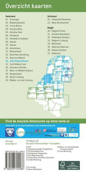 Bloembollenvelden in Zoetermeer, prachtige kuststroken en de overblijfselen van de Gouden Eeuw vallen je ten deel als je in deze regio je fietsroute uitstippelt. Via het routenetwerk en de welbekende knooppunten kom je allerlei pittoreske plaatsen en monumenten zaken tegen. De fietskaart is voorzien knooppunten, het knooppuntennetwerk, LF-routes, plaats- en straatnamenregister, toeristische VVV-informatie, horecagelegenheden en een overzicht van alle VVV-kantoren in de regio.