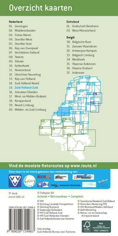 Zuid-Holland-Zuid. Een prachtige regio aan de kust inclusief het eiland Tiengemeten omringd door het Haringvliet. Delft en de Drechtsteden, vestingstad Den Briel; wat meer wil je zien? Ontdek met deze fietskaart de mooiste fietsroutes. Je verdwaald nooit, alle straatnamen in het buitengebied zijn aangegeven. Wel zo handig!