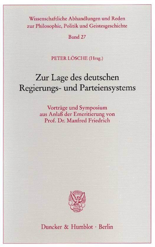 Prof. Dr. Manfred Friedrich hat uber mehrere Jahrzehnte an der Georg-August Universitat Gottingen gewirkt. Seine Werke umfassen die ganze Breite der Politikwissenschaft. Sie reichen von der politischen Ideengeschichte uber Probleme des Parlamentarismus, der Landerparlamente und des Bundesrates bis hin zur Geschichte und zu Fragen der deutschen Staatsrechtswissenschaft. Aus Anlass seiner Emeritierung hat sich Manfred Friedrich von seinen Freunden, Kollegen, Schulern und Studenten mit einer Vorlesung "Das parlamentarische Regierungssystem des Grundgesetzes im Lichte der Staatsrechtslehre" verabschiedet. Das Seminar fur Politikwissenschaft der Gottinger Universitat hat bei dieser Gelegenheit die lange wahrende fruchtbare Kooperation mit dem zu Ehrenden durch ein Symposium "Zur Lage des deutschen Regierungs- und Parteiensystems" gewurdigt. Die lebendigen, inspirierenden, durchaus auch kontroversen Beitrage dieser insgesamt organischen Tagung werden hier - gemeinsam mit der Abschiedsvorlesung von Professor Friedrich und mit zwei seine Biographie wertenden Beitragen - veroffentlicht. Im Mittelpunkt der Debatte steht die Frage, wie der unleugbare Transformationsprozess, den die deutschen Parteien und das Parteiensystem momentan durchlaufen, im Kontext des Regierungssystems zu interpretieren ist, ob als Krise, als reformerische Veranderung, als Herausbildung ganz neuartiger Parteitypen oder ob gar das Ende der Parteien und des Parteienstaates angesagt ist.