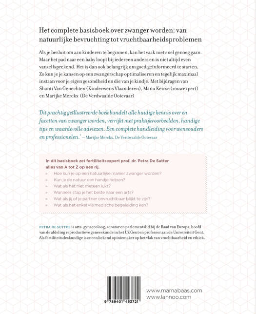 Het complete basisboek over zwanger worden: van natuurlijke bevruchting tot vruchtbaarheidsproblemen Als je besluit om aan kinderen te beginnen, kan het vaak niet snel genoeg gaan. Maar het pad naar een baby loopt bij iedereen anders en is niet altijd even vanzelfsprekend. Het is dan ook belangrijk om goed geïnformeerd te starten. Zo kun je je kansen op een zwangerschap optimaliseren en tegelijk maximaal instaan voor je eigen gezondheid en die van je kindje. Met bijdragen van Shanti Van Genechten (Kinderwens Vlaanderen), Manu Keirse (rouwexpert) en Marijke Merckx (De Verdwaalde Ooievaar) In dit basisboek zet fertiliteitsexpert prof. dr. Petra De Sutter alles van A tot Z op een rij. »» Hoe kun je op een natuurlijke manier zwanger worden? »» Kun je de natuur een handje helpen? »» Wat als het niet meteen lukt? »» Wanneer stap je het beste naar een arts? »» Wat als jij of je partner onvruchtbaar blijkt te zijn? »» Wat als het enkel via medische begeleiding kan?