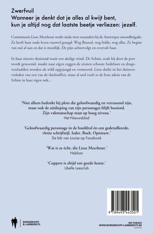 Commissaris Liese Meerhout werkt sinds twee maanden bij de Antwerpse moordbrigade. Ze heeft haar oude leven vaarwel gezegd. Weg Brussel, weg liefde, weg alles. Ze begint van nul af aan en dat is moeilijk. De pijn achtervolgt en overvalt haar.