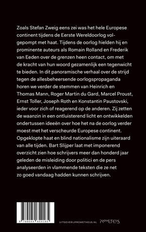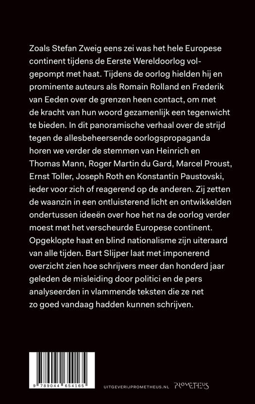 Zoals Stefan Zweig eens zei was het hele Europese continent tijdens de Eerste Wereldoorlog volgepompt met haat. Tijdens de oorlog hielden hij en prominente auteurs als Romain Rolland en Frederik van Eeden over de grenzen heen contact, om met de kracht van hun woord gezamenlijk een tegenwicht te bieden. In dit panoramische verhaal over de strijd tegen de allesbeheersende oorlogspropaganda horen we verder de stemmen van Heinrich en Thomas Mann, Roger Martin du Gard, Marcel Proust, Ernst Toller, Joseph Roth en Konstantin Paustovski, ieder voor zich of reagerend op de anderen. Zij zetten de waanzin in een ontluisterend licht en ontwikkelden ondertussen ideeën over hoe het na de oorlog verder moest met het verscheurde Europese continent.