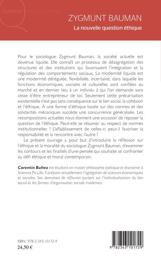 Pour le sociologue Zygmunt Bauman, la société actuelle est devenue liquide. Elle connaît un processus de désagrégation des structures et des institutions qui favorisaient l'intégration et la régulation des comportements sociaux. Or, les recompositions actuelles nous donnent une occasion de reposer la question de l'éthique. Le présent ouvrage a pour but d'introduire la réflexion sur l'éthique et la moralité du sociologue Zygmunt Bauman et d'examiner une pensée qui souhaite se confronter au défi éthique et moral contemporain.